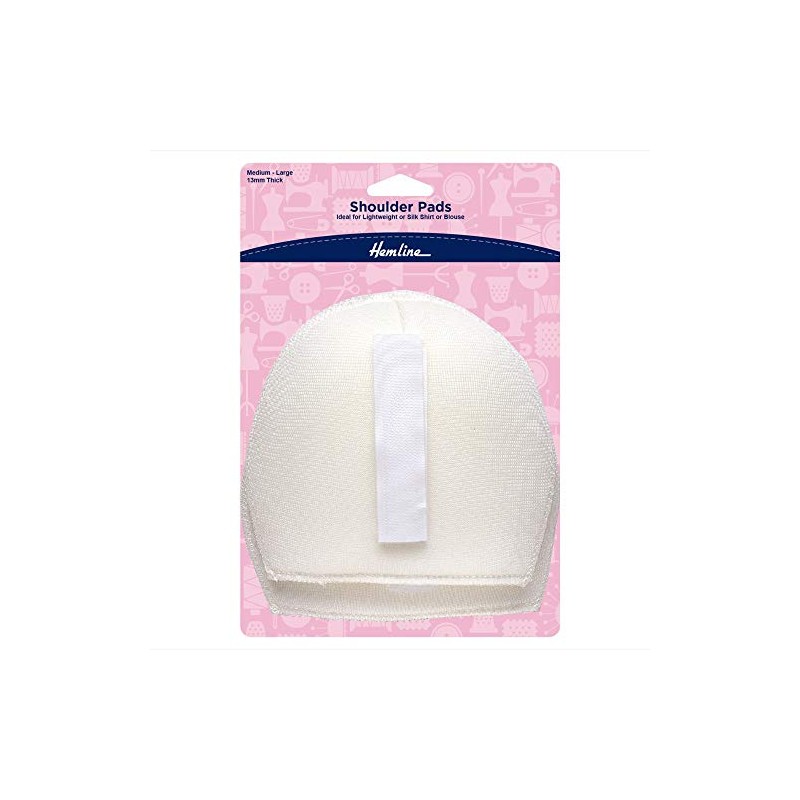 Standard shaped shoulder pad for set-in style sleeves, made of foam and covered in soft 100% cotton fabric. Exclusive sew-in/iron on hook & loop supplied with every pad, to convert a detachable pad if required, These hemline shoulder pads are especially designed for high shoulder profile. 1 pair: 14 x 16cm, 13mm thick.
