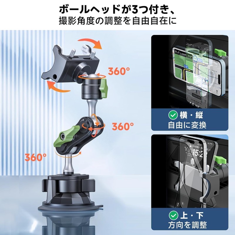- 360° Free Rotation: The suction cup camera mount has a double ball head design that rotates 360° and supports all shooting views. The smartphone holder can be freely converted horizontally and vertically, and it can be adjusted to suit people's eyes easily. Large knob for easy maneuverability and quickly adjust position of suction cup mount