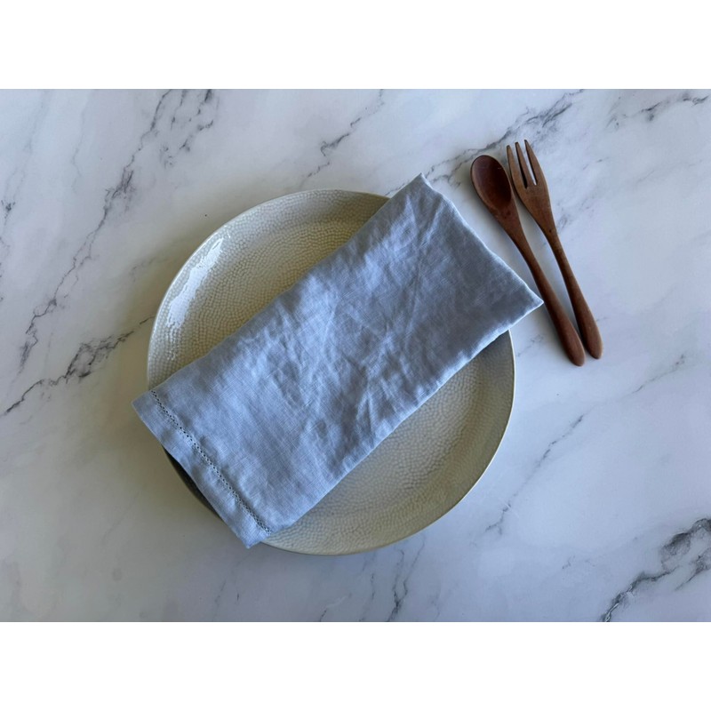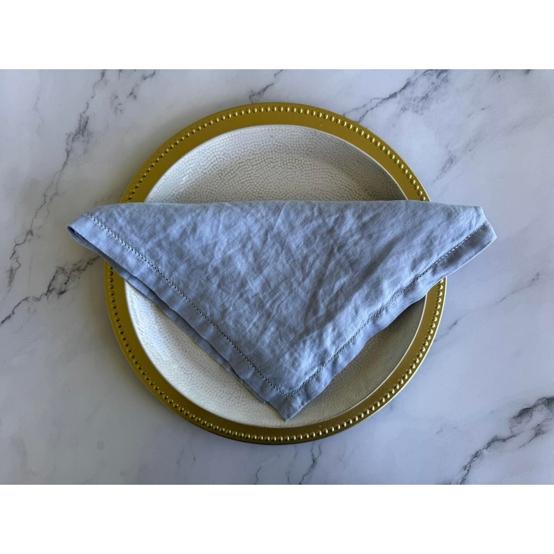 - Hemstitched stonewashed linen cloth dinner napkins created from french flax. Featuring classic mitered corners in size 50 cm x 50 cm and packaged as a set of 4. Blue with a hint of lavender creates a lovely dusty blue shade.
