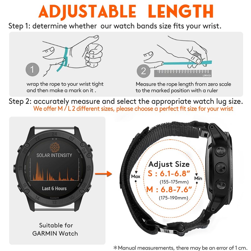 - Sporty and Heavy Duty Style Watch Bands for Garmin Watches -Please confirm your watch size before ordering. you can know your model number by checking the description on the back of the watch. then choose the correct size according to our size display. Compared to other straps, the new upgraded design of the connector will make you fall in love with the process of snap on/off. very strong and durable, fits for heavy duty activity.