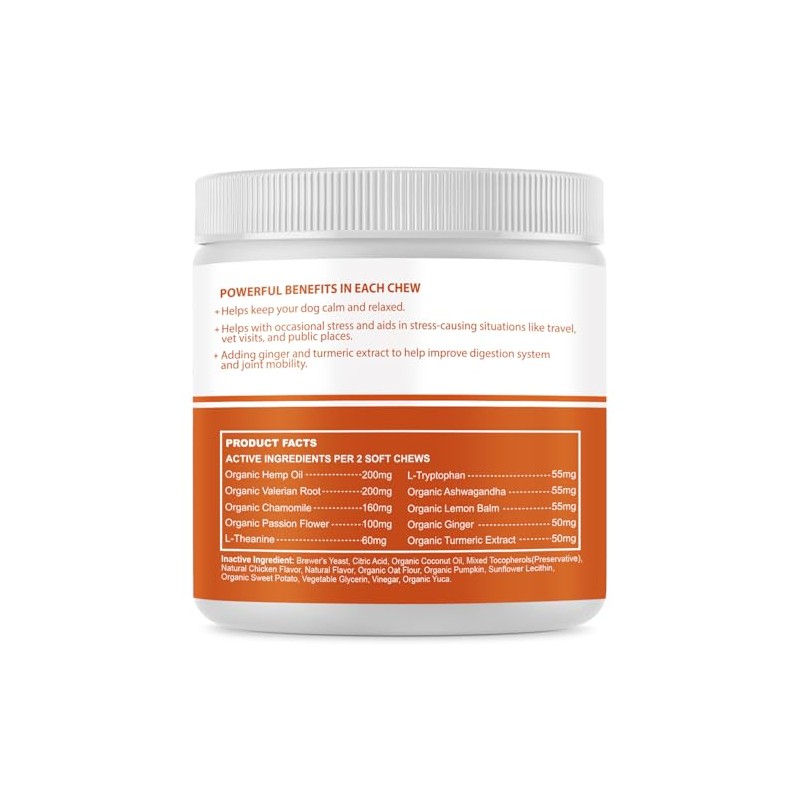 - Powerful 10-Ingredient Calming Blend: Our calming chews combine Hemp Oil, Valerian Root, Chamomile, Passion Flower, L-Theanine, L-Tryptophan, Ashwagandha, Lemon Balm, Ginger, and Turmeric Extract. This unique formula works synergistically to naturally reduce anxiety and stress, providing effective, holistic calming support.