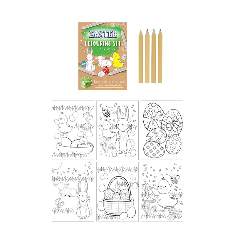 - Each Easter colouring set for kids includes 6 pages of Easter themed pictures to colour creatively and 4 colouring pencils.