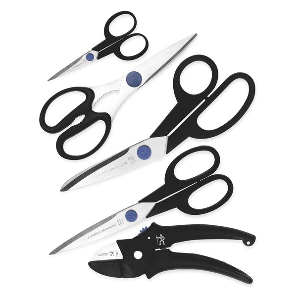 Known primarily for their well-crafted knives, Henckels also makes scissors and employs the same high-quality standards in their construction. This set includes five different pairs of scissors that cover a variety of household uses: standard 8-1/2-inch bent scissors for cutting paper or fabric, 8-inch kitchen shears for poultry or herbs (this pair also features a screw-cap opener between the handles), a 6-inch straight trimmer for cutting hair or trimming beards, 6-inch flower shears for clipping rose stems or trimming house plants, and a pair of extra-sharp, pointed 4-inch embroidery scissors for sewing. Henckels uses the same high-carbon stainless steel for its scissor blades as for its knife blades to ensure durability and a longer-lasting sharp edge. The blades (except the flower shears) are held together with a screw that provides the perfect amount of tension and is removable so blades can be individually resharpened. Handles on all scissors are made of comfortable, nonslip, black polypropylene to reduce strain on hands. This set is fully guaranteed against defects in material and workmanship. _\--Cristina Vaamonde_