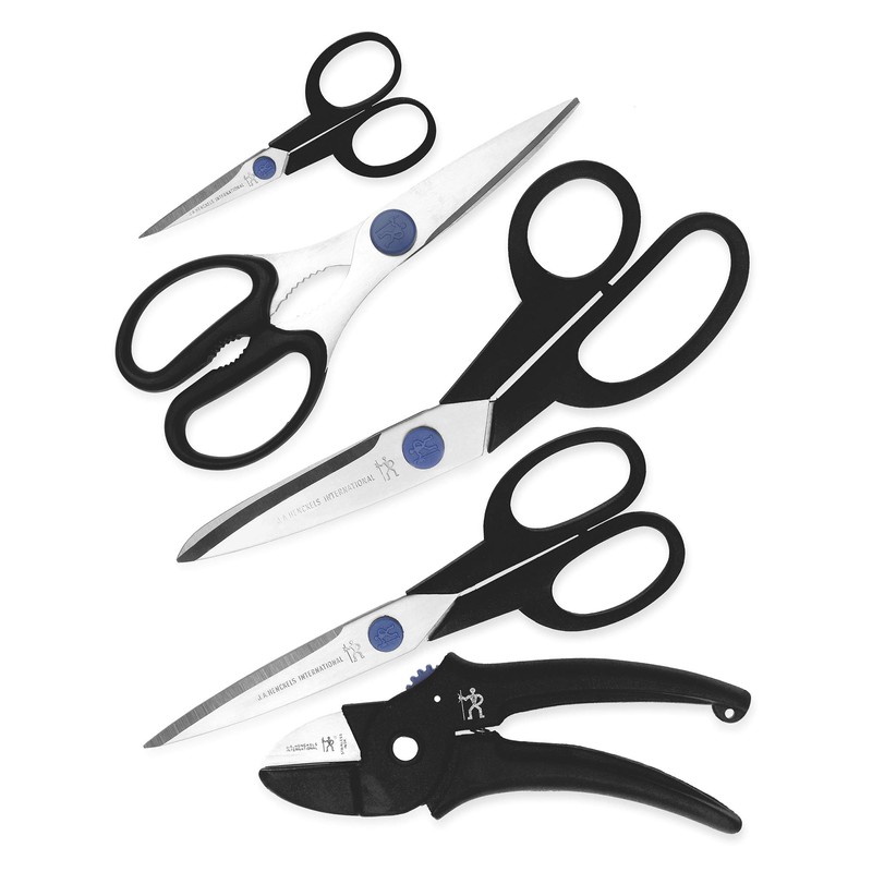 A complete assortment of multipurpose shears which function for all cutting purposes in the kitchen and the household. J.A. Henckels International 5 Piece Scissors Set includes: 4" embroidery scissors (designed for delicate cutting needs with 2 extra s