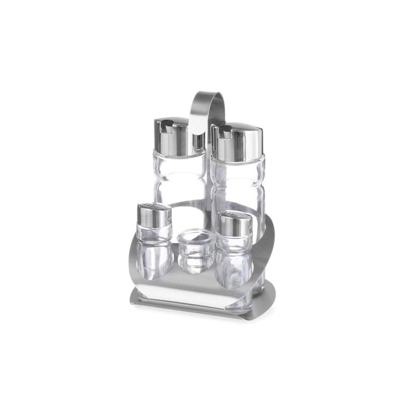 HENDI Menage Set, Fünfteilig, Pfeffer, Salz, Öl, Essig, Zahnstocherhalter Satiniert, Pfefferstreuer, Salzstreuer, Gewürzständer, 130x110x(H)185mm, Edelstahl 18/0