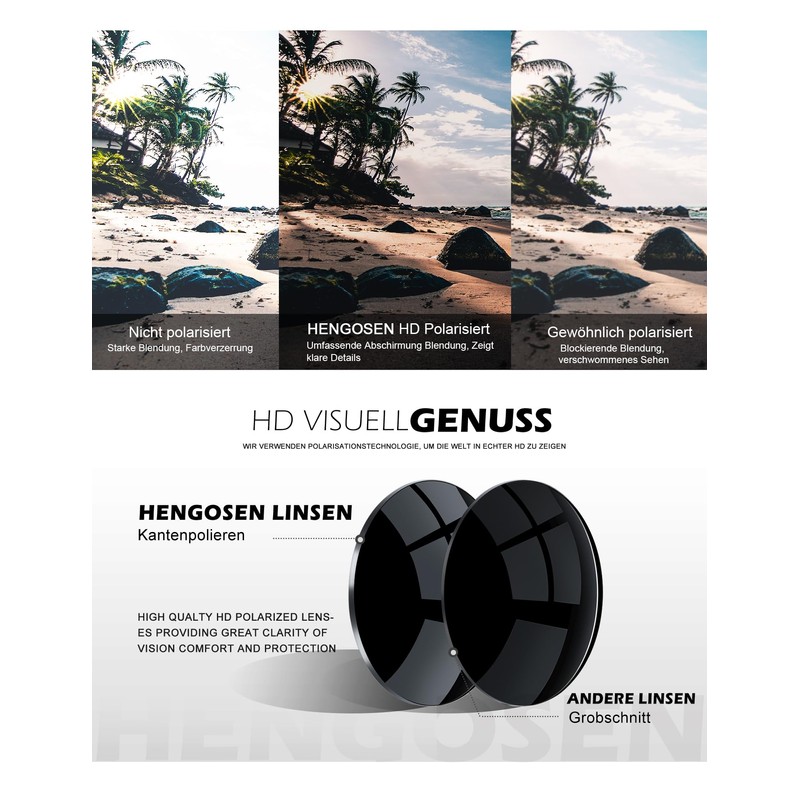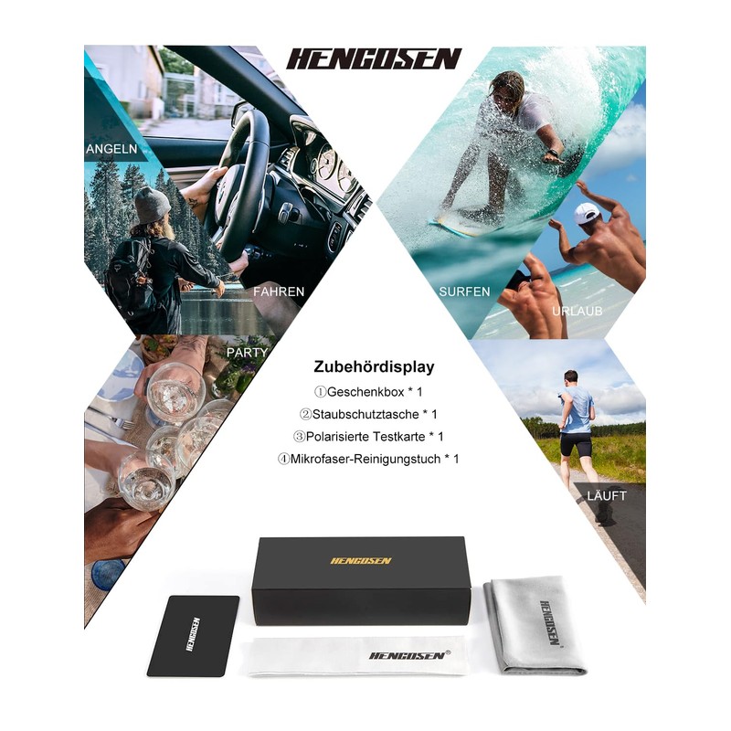 - Packaging: In the exquisite box, we offer sunglasses x 1, polarised test card x 1, microfibre cleaning cloth x 1, dust bag x 1, which will be a great gift for your family and friends HENGOSEN sunglasses customers can enjoy a money back guarantee. If there is any problem with HENGOSEN sunglasses, feel free to contact us, we are always here.