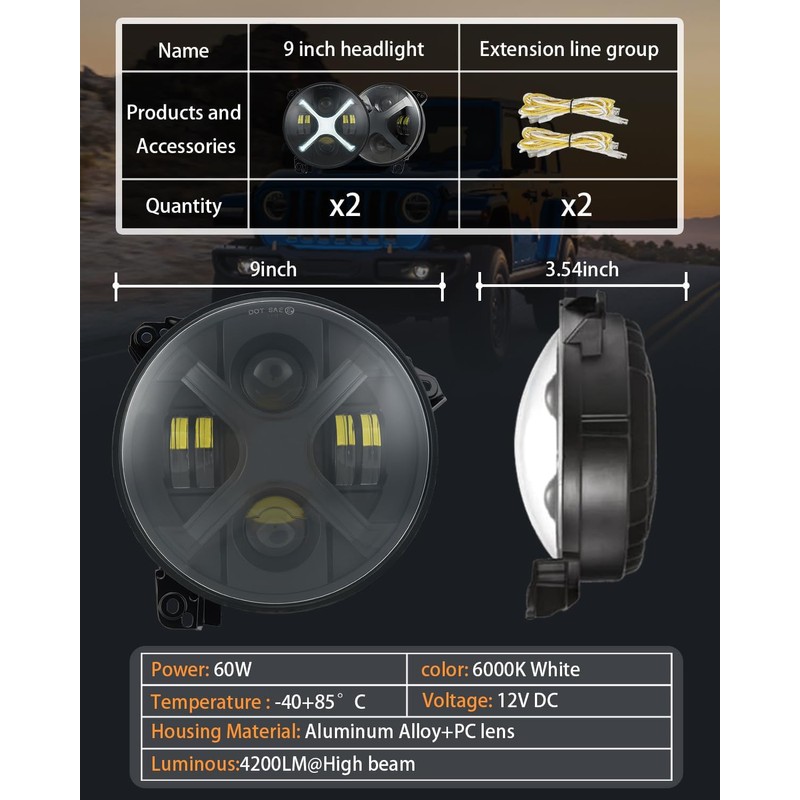 • Bright Performance: 12V DC voltage, powerful light sources of High Beam 60W(4200lm) / Low Beam 40W(2800lm), much brighter than original Halogen Headlight, sharp cut-off line with superior light output ensures NOT blind others' eyes while providing the brightest and widest vision.The 9 inch headlights are No bracket needed, just plug and play. With up / down adjustable screws, you could change beam angle easily