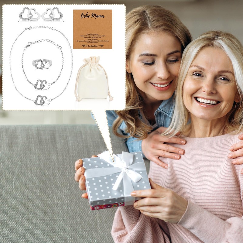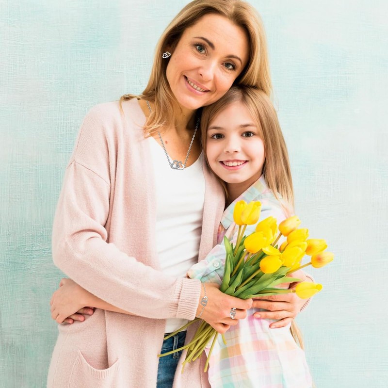 - 【Heart-shaped Design】: The love between mother and daughter is eternal, nothing can change. This necklace, bracelet, earrings and ring for mothers are all designed with two connected hearts. It is a very warm and beautiful jewellery set that expresses the sincere love for mother