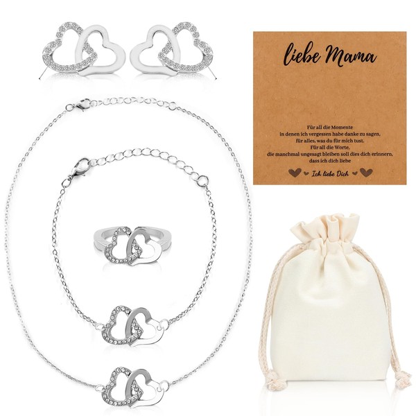 Henjunu Mother Necklace, Mother's Day Gift Mum, Heart Jewellery Gift for Mother, Heart Necklace with Bracelet, Ring Earrings, for Mother's Day, Birthday, Christmas, Silver, 1