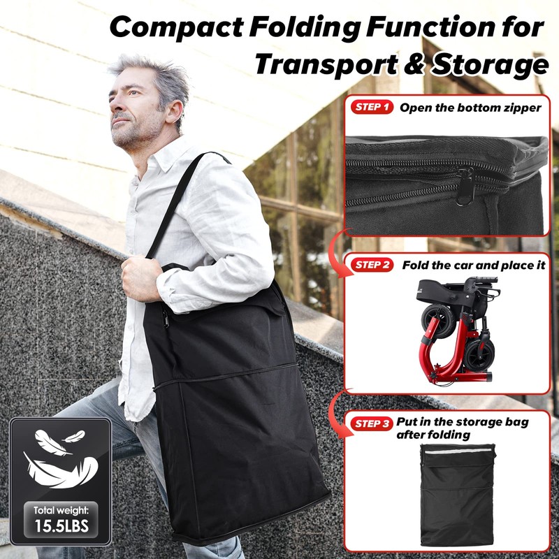 Henmnii Rollator Walker Storage Bag – Expandable Organizer with Shoulder Strap & Reflective Strip, 16.3"x7.1"x11.4"-26", Large Capacity Accessory for Mobility Aids