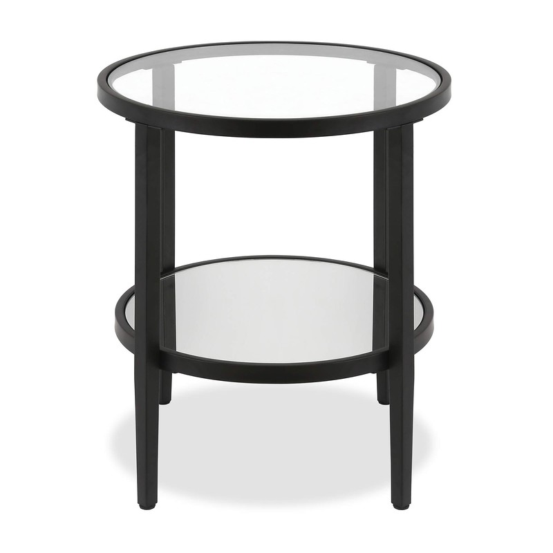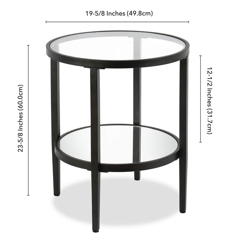 Showcase your space with this contemporary piece Designed to highlight its surroundings. This sleek and streamlined side table is supported by solid bands of metal. Features a mirrored shelf to showcase your belongings.