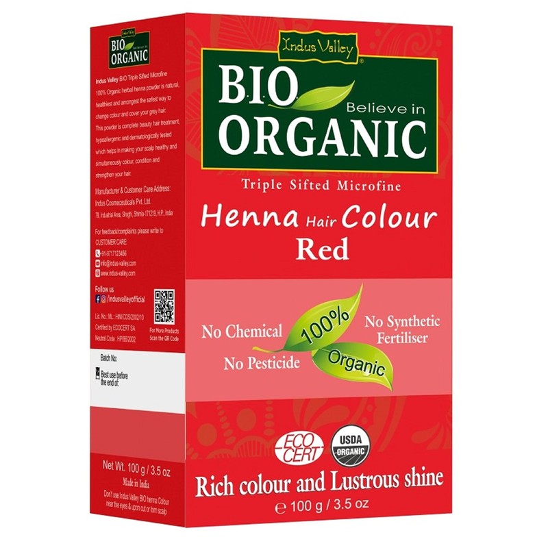 - Indus Valley 100% organic red henna hair colour powder is a triple sifted microfine powder, it is 100% free from pesticides, chemicals and additives.