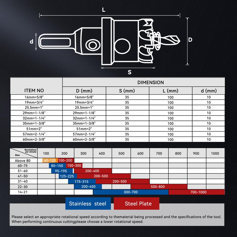 - 📌【Warm Reminder】For best performance, drill vertically to avoid bit breakage. When using the pilot bit alone, start with low torque and speed. Gradually increase the speed when the hole saw touches the material. Use cutting oil as lubricant to prevent bit overheating, burning or breakage.Above 1.5mm thickness, we recommend adding water or coolant.