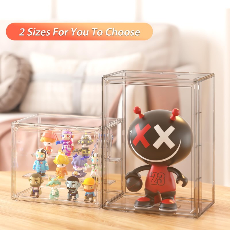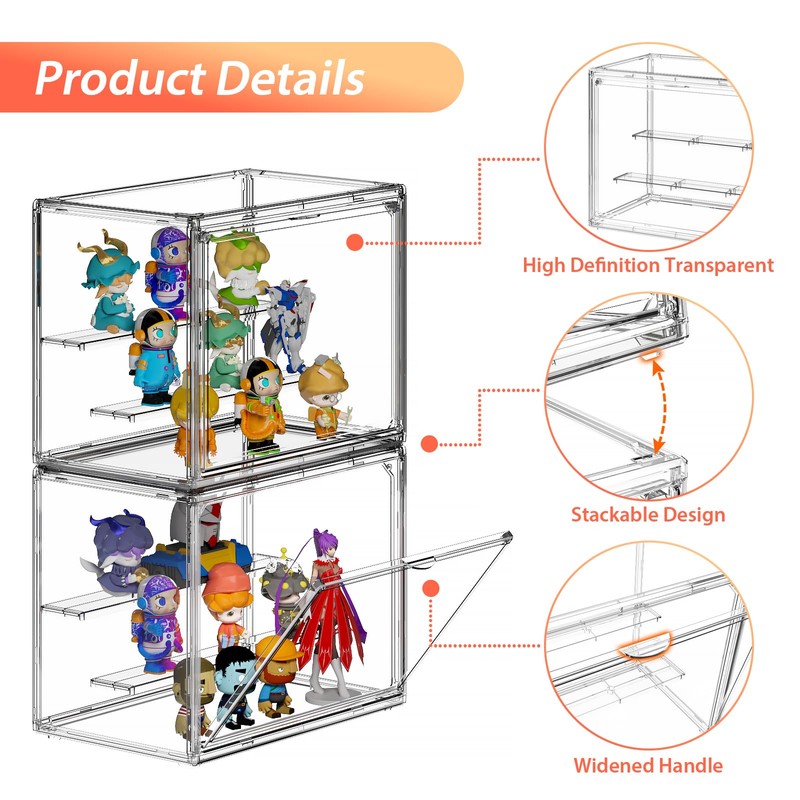 - Stackable Design for Space-saving: The stackable acrylic display box features the latest innovative stacking design, providing enhanced safety and stability, stacked on top of or beside each other to save much more space in your desktop, playroom, or wardrobe.