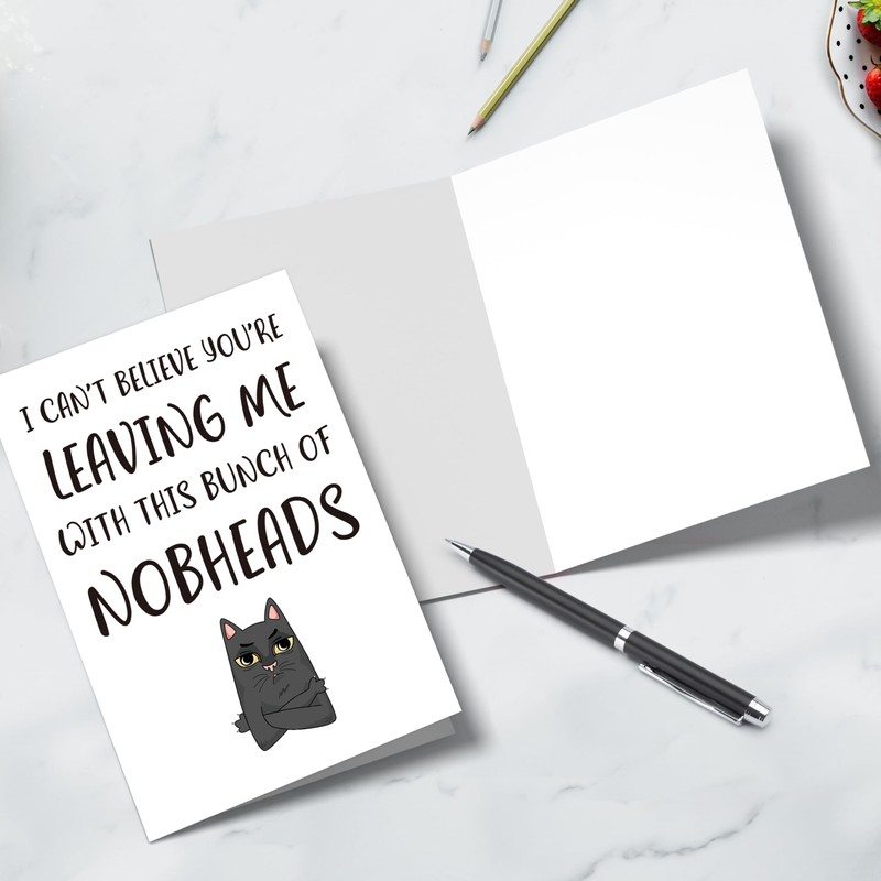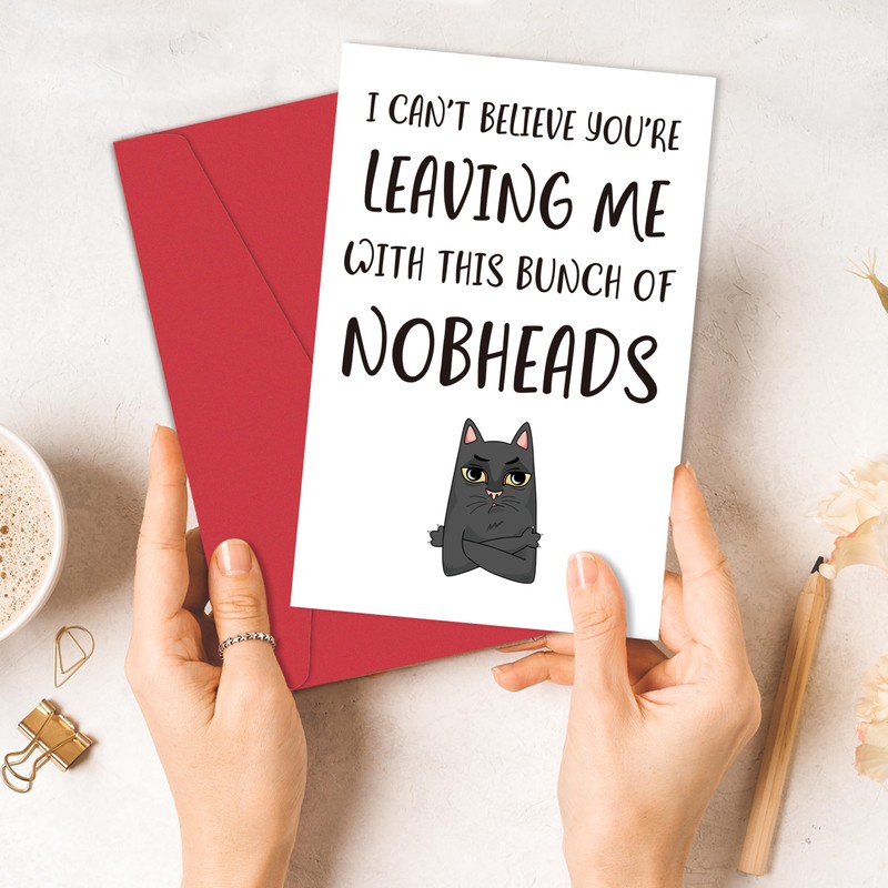 - This coworker leaving gift card features a witty message: "I can't believe you're leaving me with this bunch of nobheads." It's sure to put a smile on the recipient's face and make their goodbye more memorable. Perfect as a funny farewell card for both men and women, it captures the humor in saying goodbye.