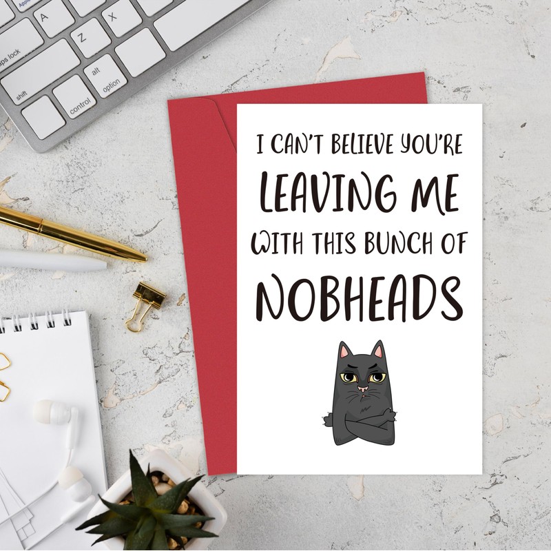 - This coworker leaving gift card features a witty message: "I can't believe you're leaving me with this bunch of nobheads." It's sure to put a smile on the recipient's face and make their goodbye more memorable. Perfect as a funny farewell card for both men and women, it captures the humor in saying goodbye.