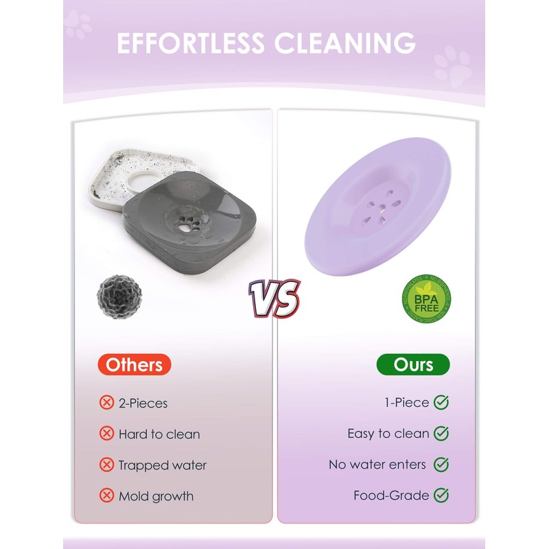 - 【One Piece Molded Floating Disk】Besides lid, the bowl also goes with a floating disk to slow down water drinking, also helps prevent dust, dirt, and pet hair from falling into the water. What’s more, it is an upgraded one piece molded floating disk, no water seepage, never get moldy or dirty, no need to pry open for cleaning.