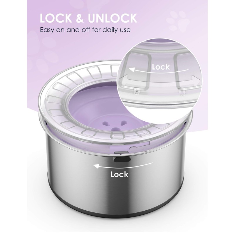 - 【Convenient & Widely Use】The lid is lock and unlock easily. Clean the bowl by unlock the lid, and put the bowl body, lid and floating disk in the dishwasher, very convenient and safe. The anti-spill lid and floating disk, as well as anti-slip silicone base make the bowl not only good for home use, but also great in cars, RVs and boats.