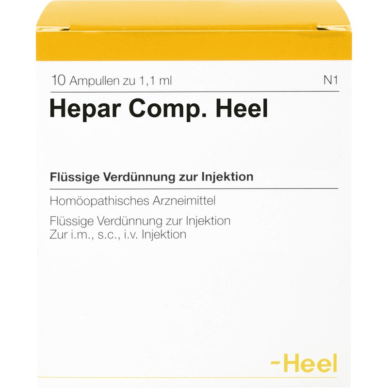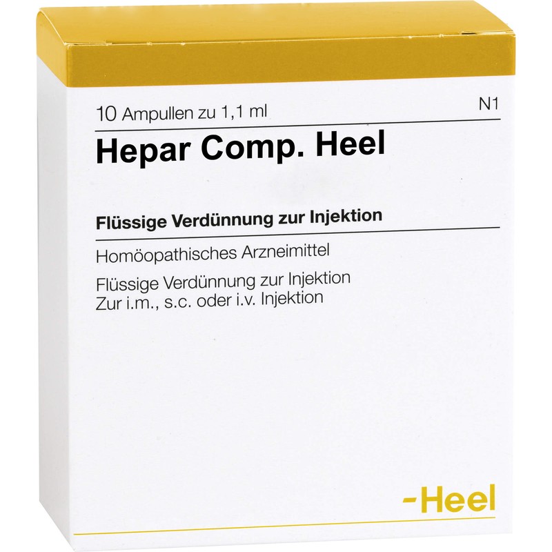 Hepar comp. Heel, Flüssige Verdünnung zur Injektion. Anwendungsgebiete: Registriertes homöopathisches Arzneimittel, daher ohne Angabe einer therapeutischen Indikation.