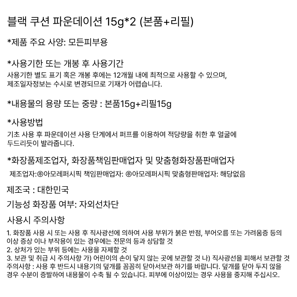 Hera NEW 헤라 블랙쿠션 파운데이션 리필15g (SPF34/PA++) (옵션 선택) NEW Hera Black Cushion Foundation Refill 15g (SPF34/PA++) (Option Select)