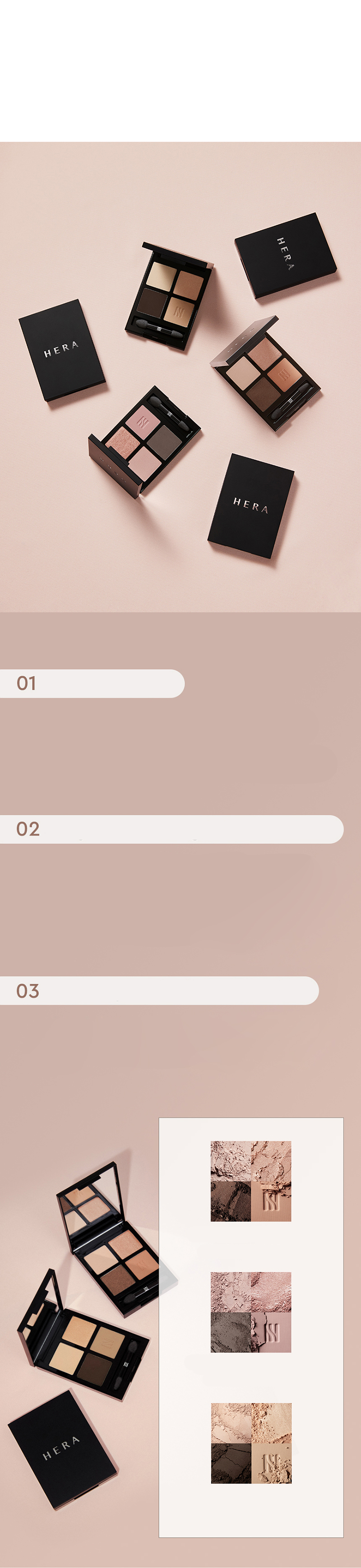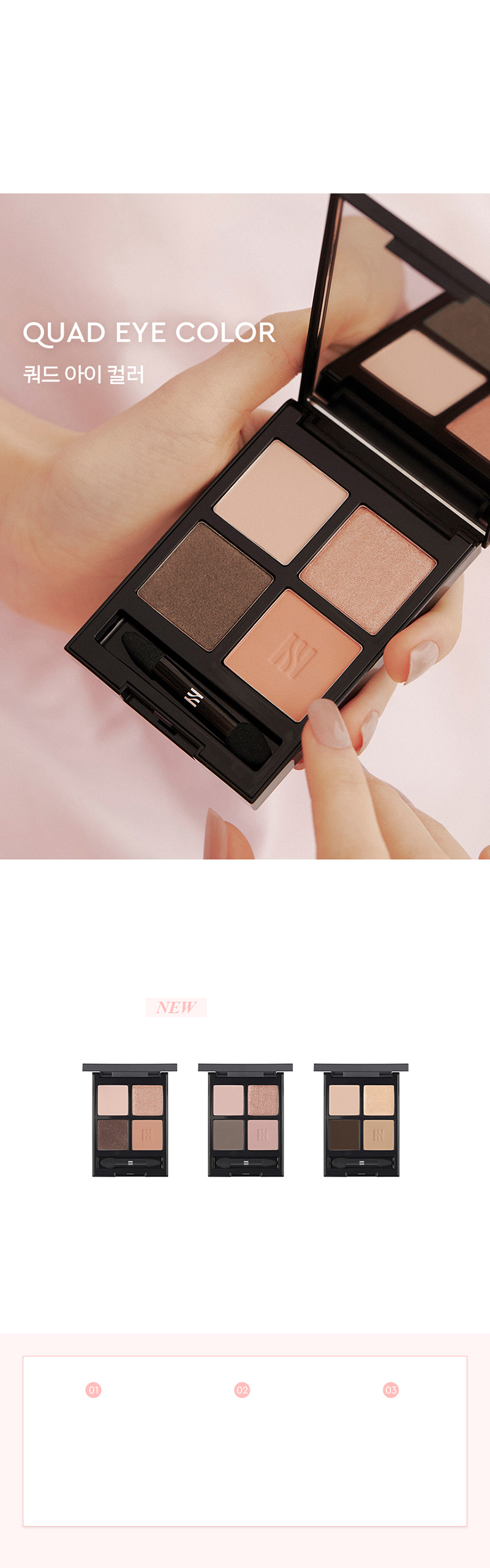 The 4-shaded eye shadow palette provides soft long-wear texture and highly sensitive shades with single touch. The lightweight yet detailed contouring effect provides soft yet bold eye makeup. The 4-shaded palette is made with collaboration with research institute and makeup artists. The color combination can be widely used to provide delicate mood as it is developed with special research. The essential, wearable, and comfort color spectrum has been inspired by independent attitude that does not care about opinions of others.