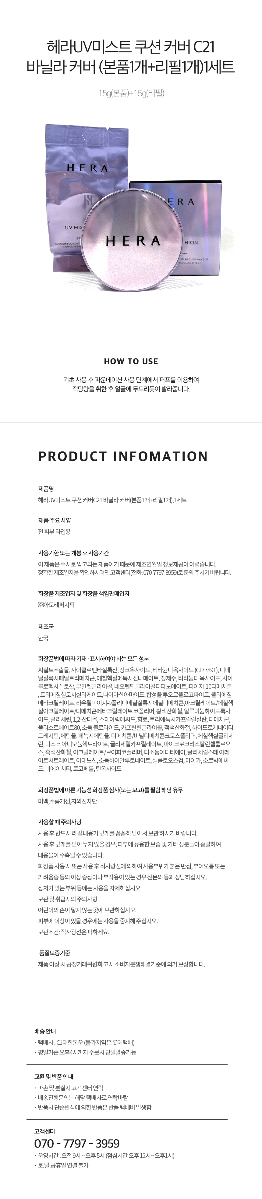 헤라UV미스트 쿠션 커버C21 바닐라 커버(본품1개+리필1개)1세트