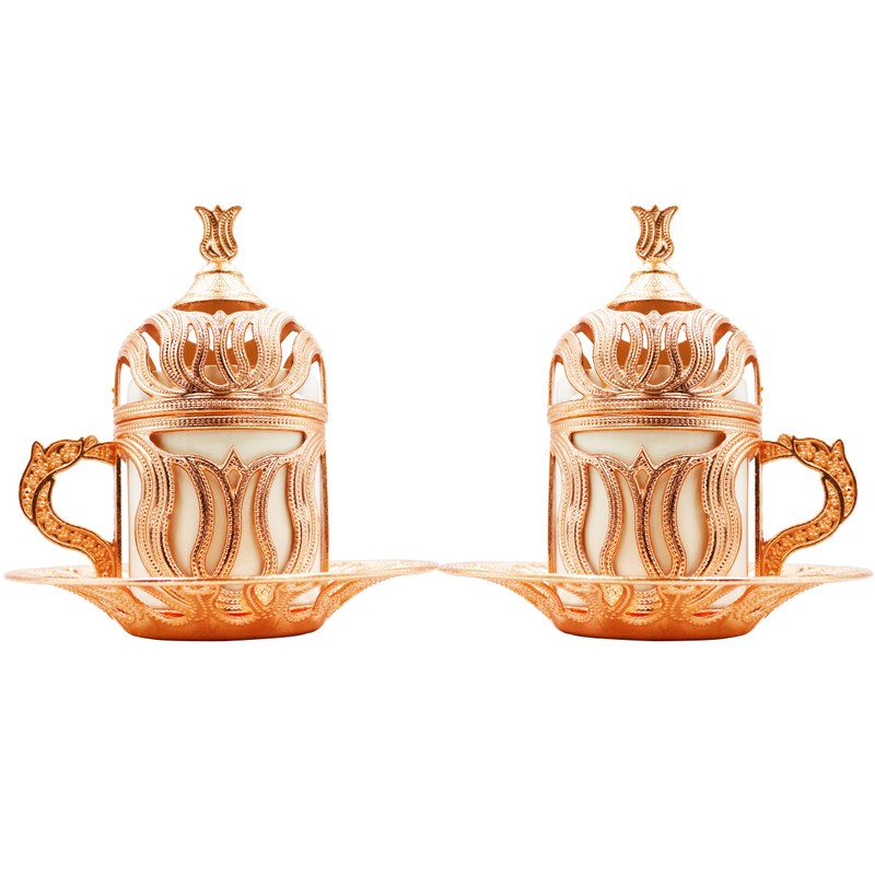 - RICH CONTENT: This set consists of 2 Rose Gold Coffee Cup Holders, 2 Porcelain Coffee Cups, 2 Lids and 2 Plates. This set consists of 8 pieces in total. Each piece is inspired by Ottoman culture.