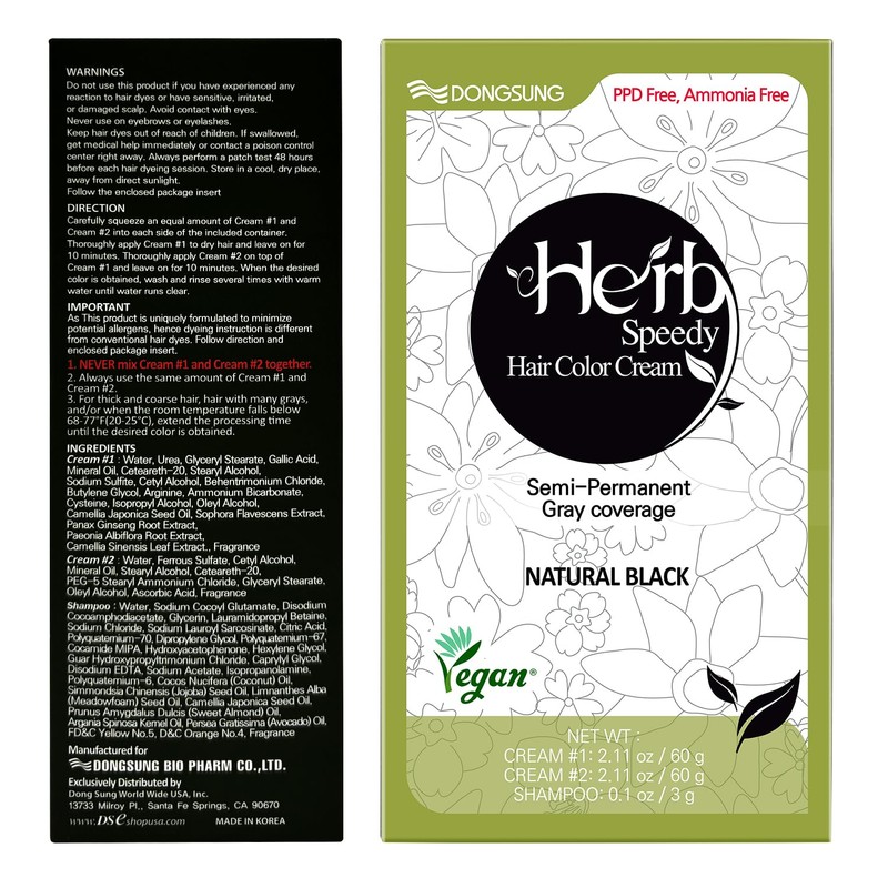 DONGSUNG Herb Speedy Permanent Color Cream (Natural Black, 1 Pack), PPD-Free Ammonia-Free Vegan Hair Dye with Sun Protection, Odorless, Gentle for Sensitive Scalp, No Eye or Scalp Irritation