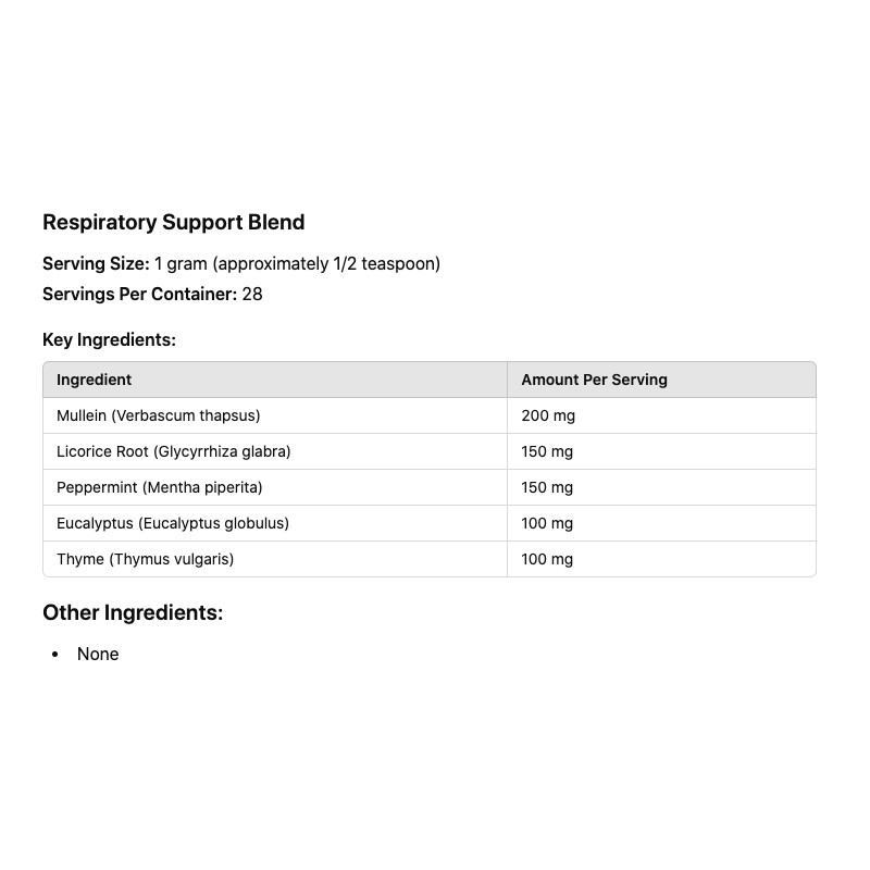 Description: Breathe easier with our premium Herbal Respiratory Support Blend, expertly crafted from the finest natural ingredients. This artisan-quality powder combines the soothing properties of mullein, licorice root, peppermint, eucalyptus, and thyme to provide effective respiratory support you can trust.