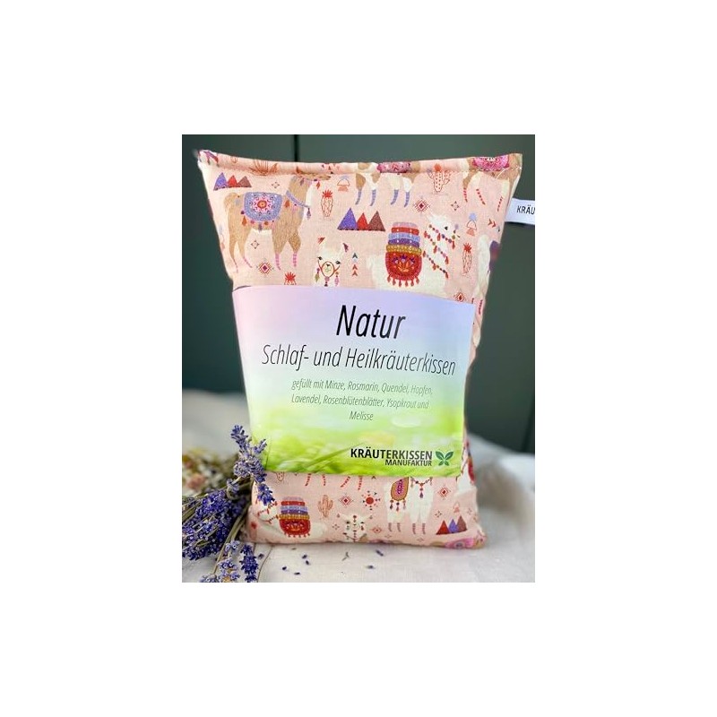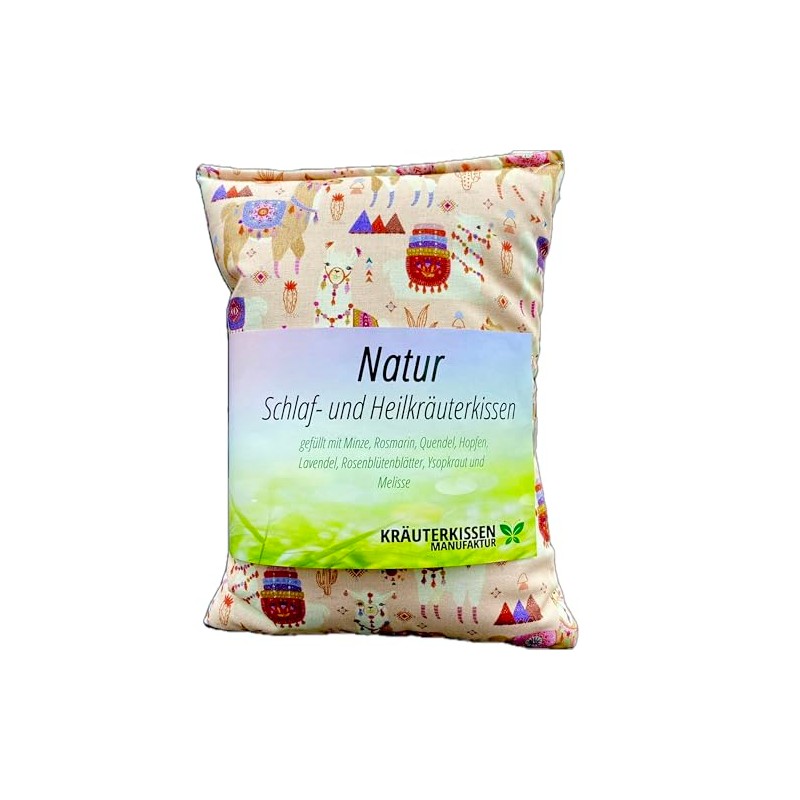 Herbal Pillow, Natural Sleeping and Healing Herb Pillow, 25 x 20 cm, Filled with 8 Different Medicinal Herbs, Including Soothing Sleep Aid, Design Llama