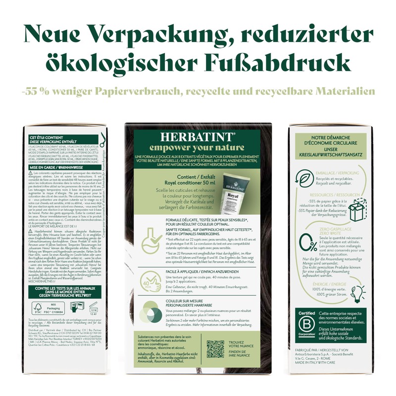 - NEW FORMAT 170 ml: Same formula - New packaging - More product! The Herbatint permanent hair dye gel (170 ml) retains its exclusive formula unchanged and offers more compact packaging made from recycled and recyclable materials. In addition, it now contains 50 ml of balm royal conditioner.