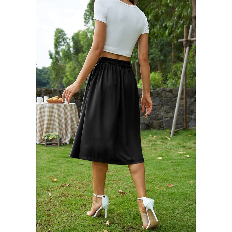HERBATOMIA Pleated Midi Black Skirt High Elastic Waist A-line Casual Flared Button Front Long Skirts with Pocket for Women