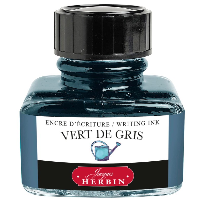 Herbin Jacques Ref 13007T - Ink for Fountain Pens & Rollerball Pens - Vert de Gris/Green-Grey - 30ml Bottle with Integrated Pen Rest - Grey-Coloured Ink