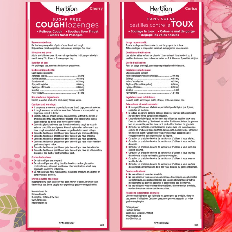 - HIGH-QUALITY, EFFICACIOUS POTENT HERBS Sugar-Free Cough Lozenges with Natural Cherry flavour consist of medicinal herbs’ extracts that have been used for centuries to relieve COUGH, NASAL CONGESTION, and SORE THROAT.