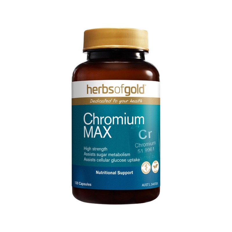 Herbs of Gold Chromium MAX is a high-strength supplement providing 250mcg of elemental chromium to assist glucose metabolism.