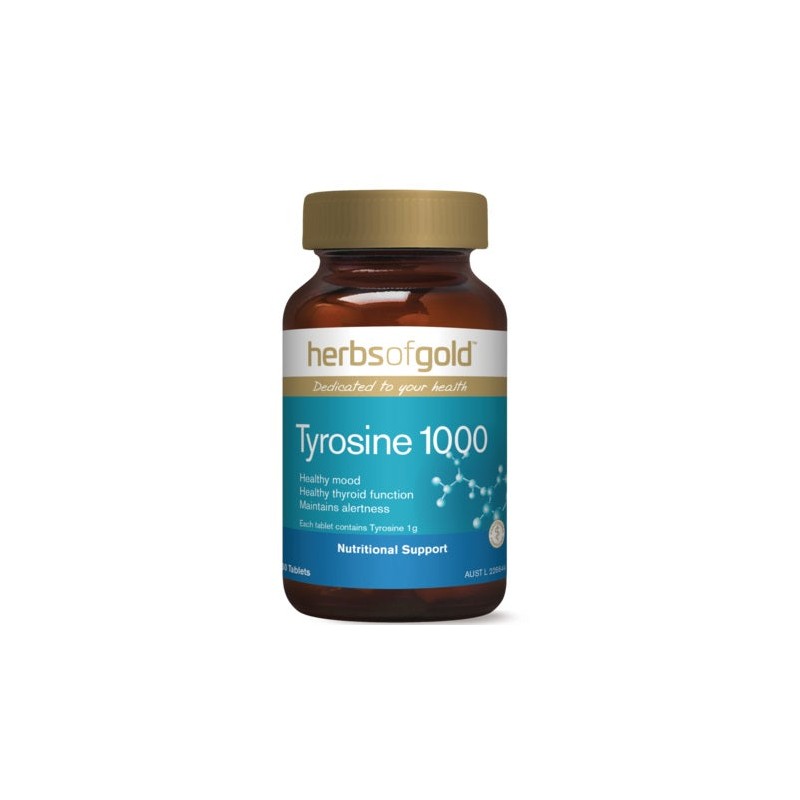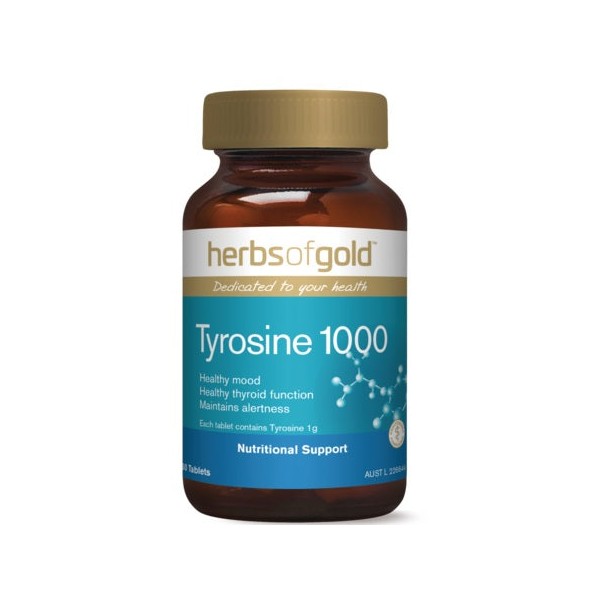Herbs of Gold Tyrosine 1000 provides high strength tyrosine in a convenient tablet form. Tyrosine is an essential precursor for the synthesis of neurotransmitters, thyroid hormones and melanin, the pigment found in hair and skin.