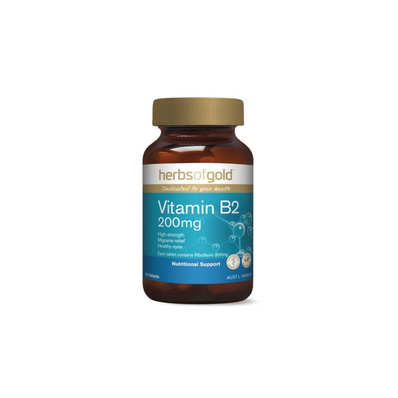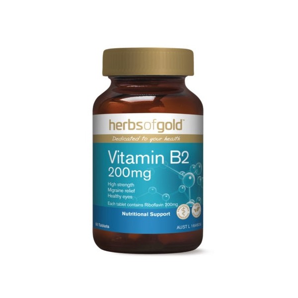 Herbs of Gold Vitamin B2 200mg contains high-strength vitamin B2, also known as riboflavin, for the prevention of a dietary vitamin B2 deficiency.