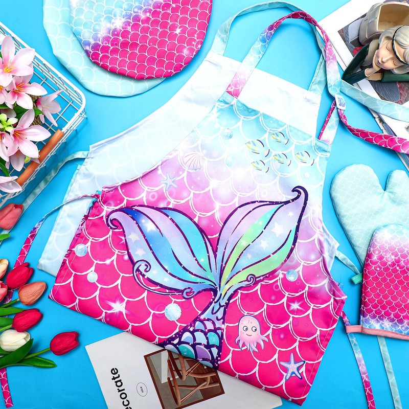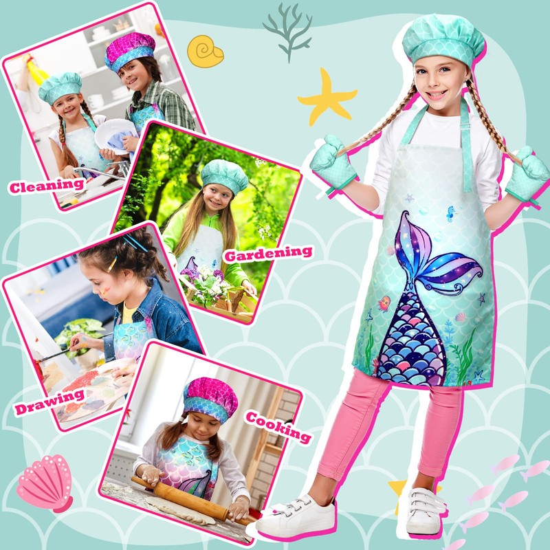 - Fun and Engaging Mermaid Scales Design: the kids' chef hats, aprons and oven mittens set features a captivating mermaid scales themed design that is sure to spark your child's imagination and make them excited about helping in the kitchen or exploring other activities; With vibrant colors and eye catching patterns, this set is nice for encouraging creativity and role play