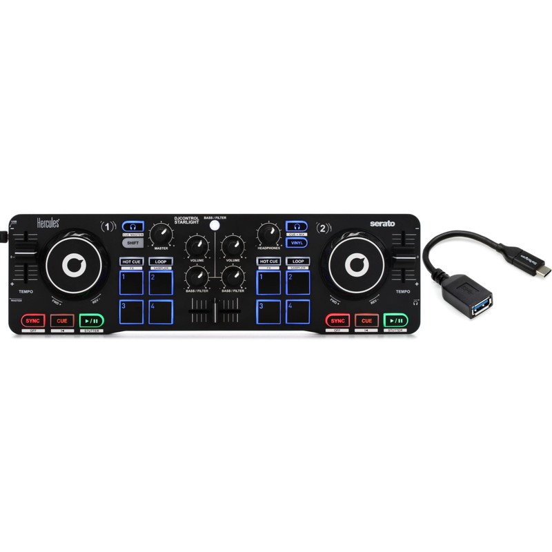 Hercules DJControl Starlight Portable 2-Channel DJ Controller with USB-C to USB-A Adapter - Compact and Lightweight DJ Controller for Beginners and Pros, Perfect for Mixing and Scratching