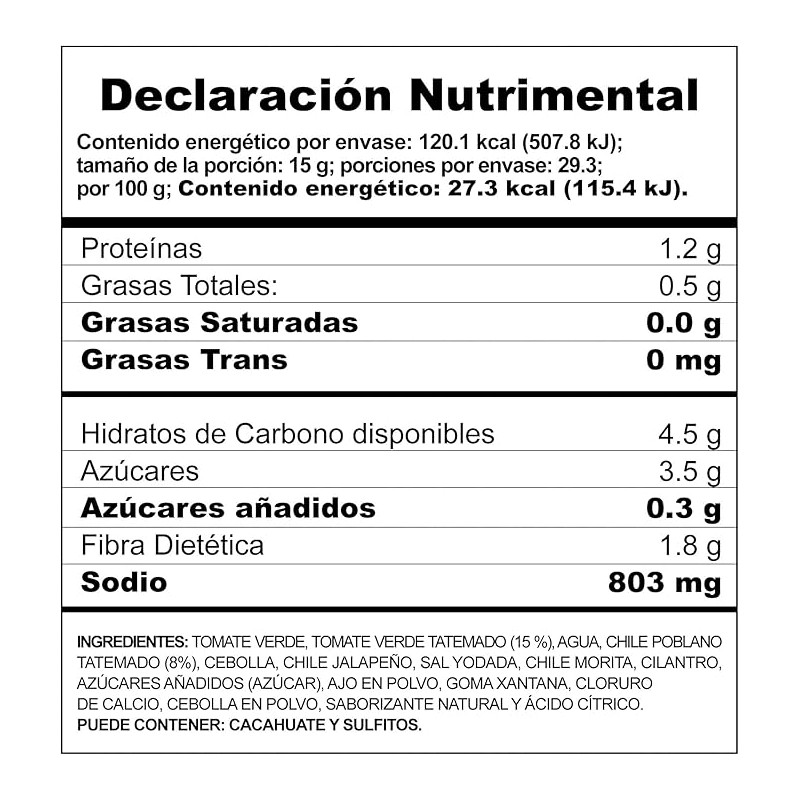 | Ingredientes | Jitomate, jitomate tatemado (16%), agua, chile poblano tatemado (8%), cebolla, chile jalapeño, pasta de tomate, sal yodada, chile morita, cilantro, ajo en polvo, cloruro de calcio, ácido cítrico, goma xantana, cebolla en polvo, saborizante natural y ácido acético. Puede contener: Cacahuate y Sulfitos. |