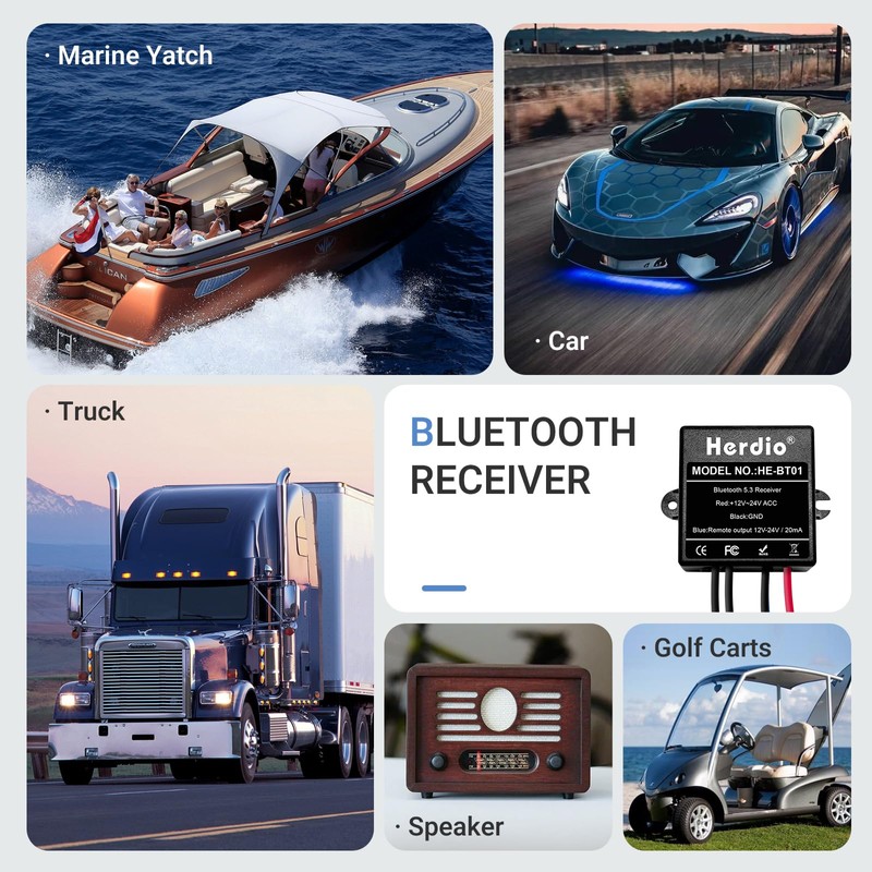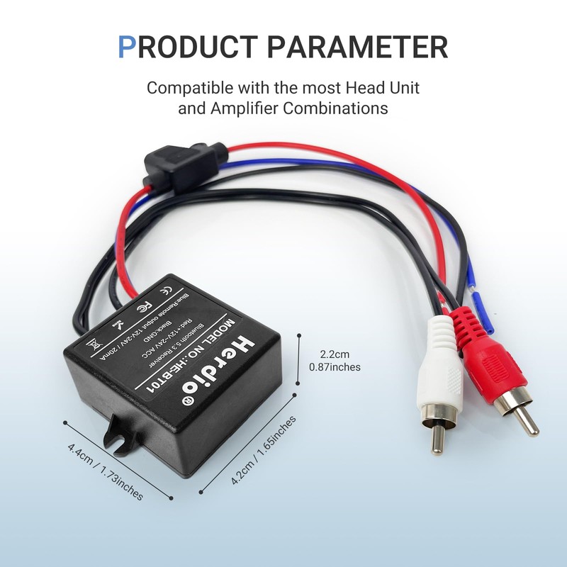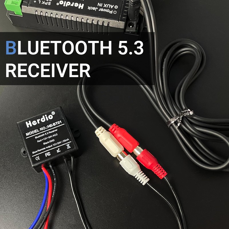 True Marine Design Complies with IP67 Waterproof for marine and powersports applications, Herdio Waterproof Bluetooth Dongle is a water resistant and corrosion for marine environment. The protection ensures no disruption to your listening pleasure. Stream Audio Music from your Smartphone Bluetooth version 5.3 certified and supports wireless music streaming. Wirelessly stream audio like Pandora and Spotify, or stored music and music apps from your Bluetooth-enabled mobile device to your audio system. Stereo RCA Outputs Connects to any powered speakers with a standard 12~24 volts power/ground and plug-and-play RCA connection to any amplifier or source unit with line-level/auxiliary inputs.—Marine Yacht, Boats, Vehicles, Cars, Motorcycles, ATV, Bath and much more. Unit installation: 1. Connect Red wire to constant power (battery) 2. Connect Black wire to chassis ground 3.Connect the Blue Strip wire (remote out to the amplifier) 4. Connect RCA output to amplifier Mounting Includes a self-adhesive backing to mount the device or you can use two screws (included) to mount the unit. Package Contents: 1 x Bluetooth Receiver 1 x 3M Adhesive Backing 2 x Screws Instruction manual