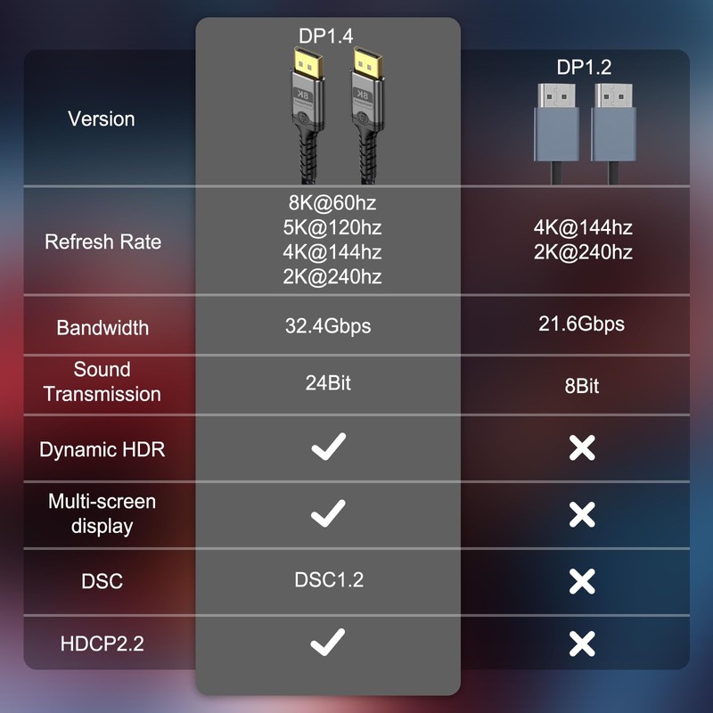 - Verbessertes Gaming-/Arbeitserlebnis: Das Displayport 1.4-Kabel bietet eine höhere Bandbreite. HBR3 unterstützt 32,4 Gbit/s Bandbreite; hohe Bildwiederholrate und hohe Auflösung, maximiert die Leistung Ihrer Grafikkarte und Ihres Monitors, ermöglicht es Ihnen, die Bewegung von allem klar wahrzunehmen. Verabschieden Sie sich von Bewegungsunschärfe, Bildschirmreißen oder Flackern. Dynamisches HDR kann das Spiel optimieren. es dunkles Bild und verbessern Die Details. Gleichzeitig bietet es auch ein besseres visuelles Erlebnis für Ihre Zeichenvideoproduktion, sodass Kreativität entsteht. Erledigen Sie eine perfekte Arbeit
