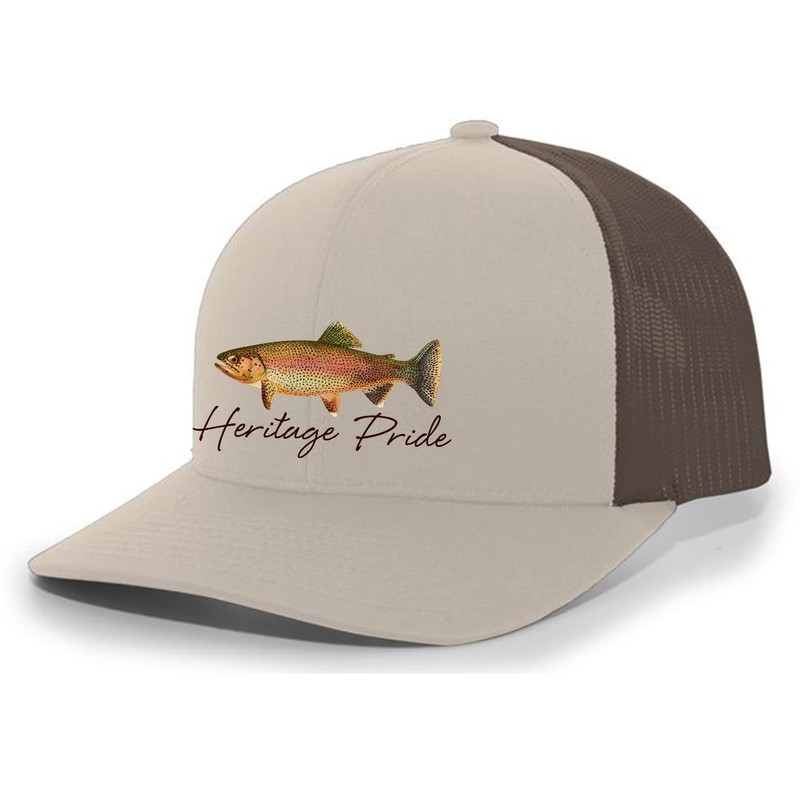 Heritage Pride Freshwater Fish Collection Trout Fishing Mens Embroidered Mesh Back Trucker Hat Baseball Cap, Brown/Khaki