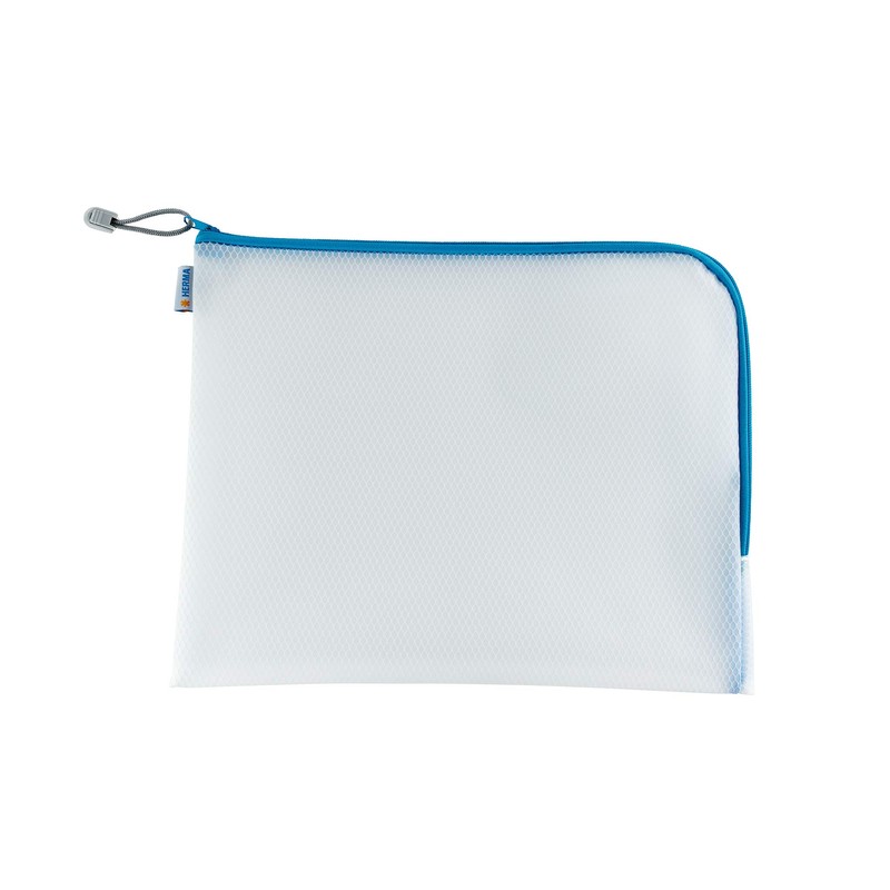 HERMA 20015 Zip Document Bag A4, transparent (36 x 28 cm) large zippered mesh pouch with zipper for laptop, tablet, books, papers, toys, clear storage wallet with zipper in blue