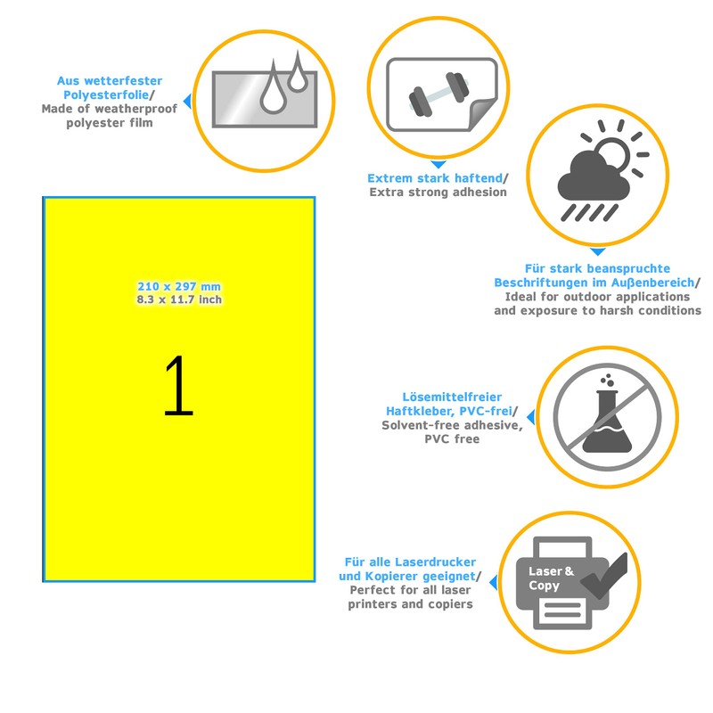 - Box contents: 25 x HERMA weatherproof foil labels, DIN A4 format, 21 x 29.7 cm, rectangular, yellow (25 sheets of 1 label)