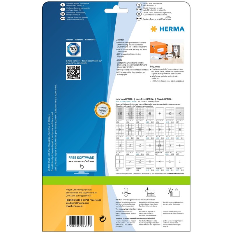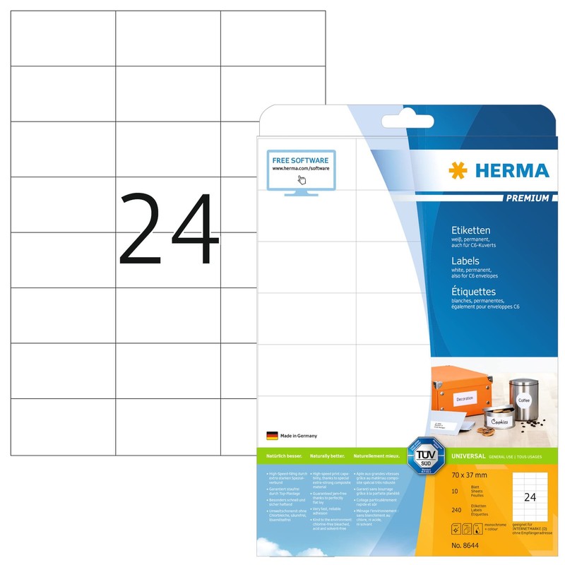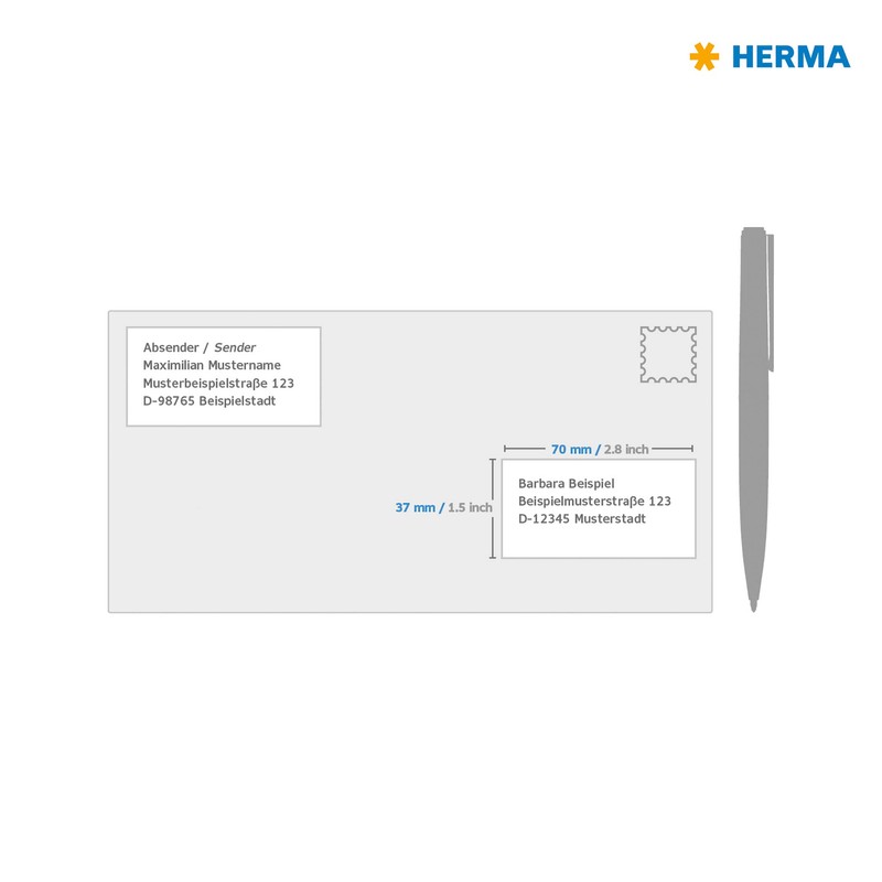 - Box contents: 240 x HERMA premium labels, DIN A4 format, 7 x 3.7 cm, rectangular, white (10 sheets each 24 labels)