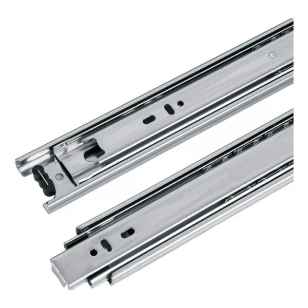 Estas correderas están fabricadas en acero con acabado niquelado, proporcionando resistencia y durabilidad. Cuentan con un sistema de balines que garantiza una operación suave y topes de retención para el cajón. Son ideales para escritorios, muebles y armarios.