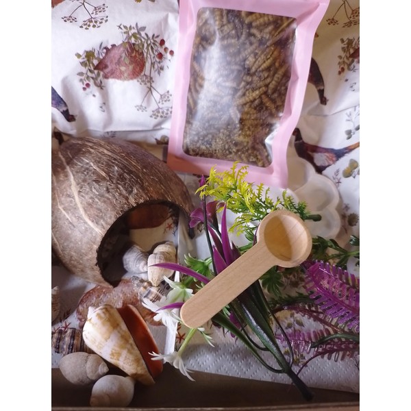 Hermit Crab Habitat Kit, Natural Coconut Hides x 1, Food Treats 10 assorted Shells, 2 x Feeding Bowls and wooden spoon & 5 artificial plants