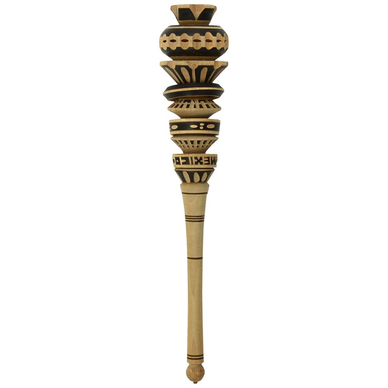 Hand carved from solid wood and burned slightly for darker shades. Slender handle makes it easy to twist between palm of hands. Smooth pestle bottom softens and grinds chocolate as it dissolves in hot milk. Loose rings aid in whipping air into hot chocolate and eventually results in frothy top.
