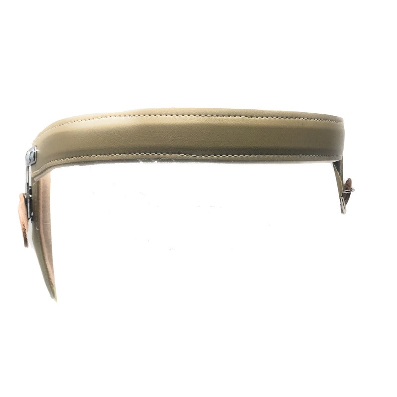 Truform-OTC brand (model 0342) single spring hernia truss. Has a steel spring, rustproof, covered with 1" synthetic leather sleeve; .875" leather fastening strap with stud holes spaced at 1" intervals. No. 391 scrotal pad, with perineal strap and universal adjustment fixture, covered with synthetic leather. Plated steel shank with 1" long slot to allow for pad adjustment. Made in the U.S.A. Measure around the hip, not waist. Measurement should be taken directly on the skin.